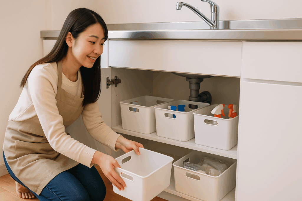 少しの工夫で、シンク下は驚くほど見違えります。まずは、今日使う洗剤や布巾を1つのボックスにまとめてみましょう。きっと“使いやすさ”を実感できるはずです。