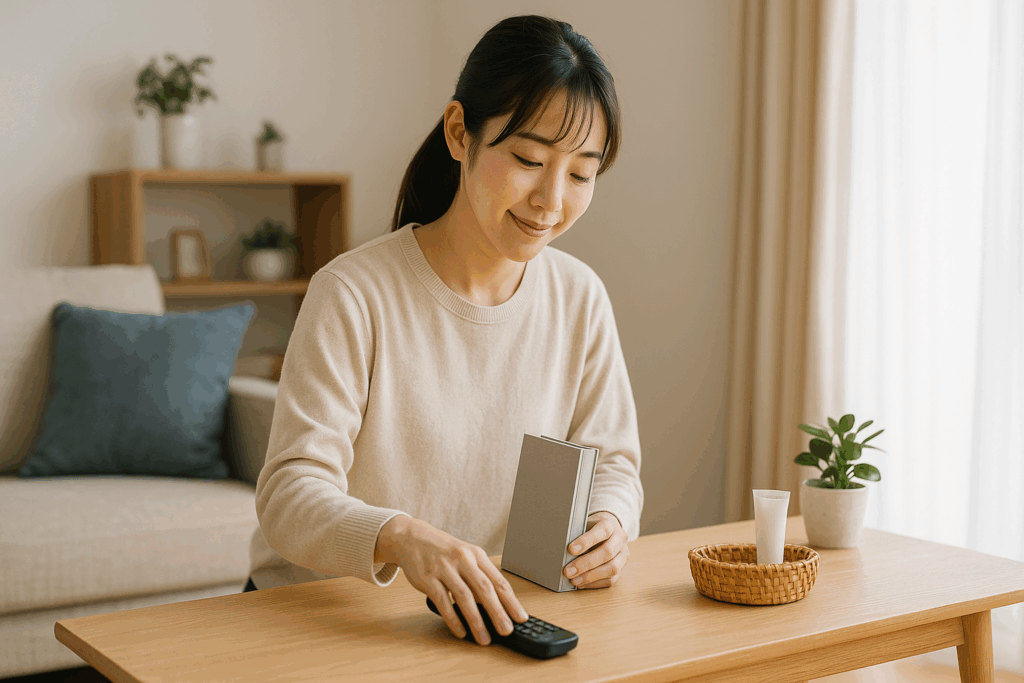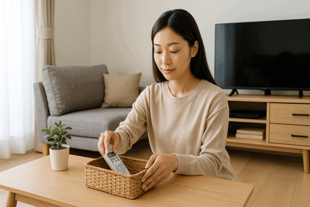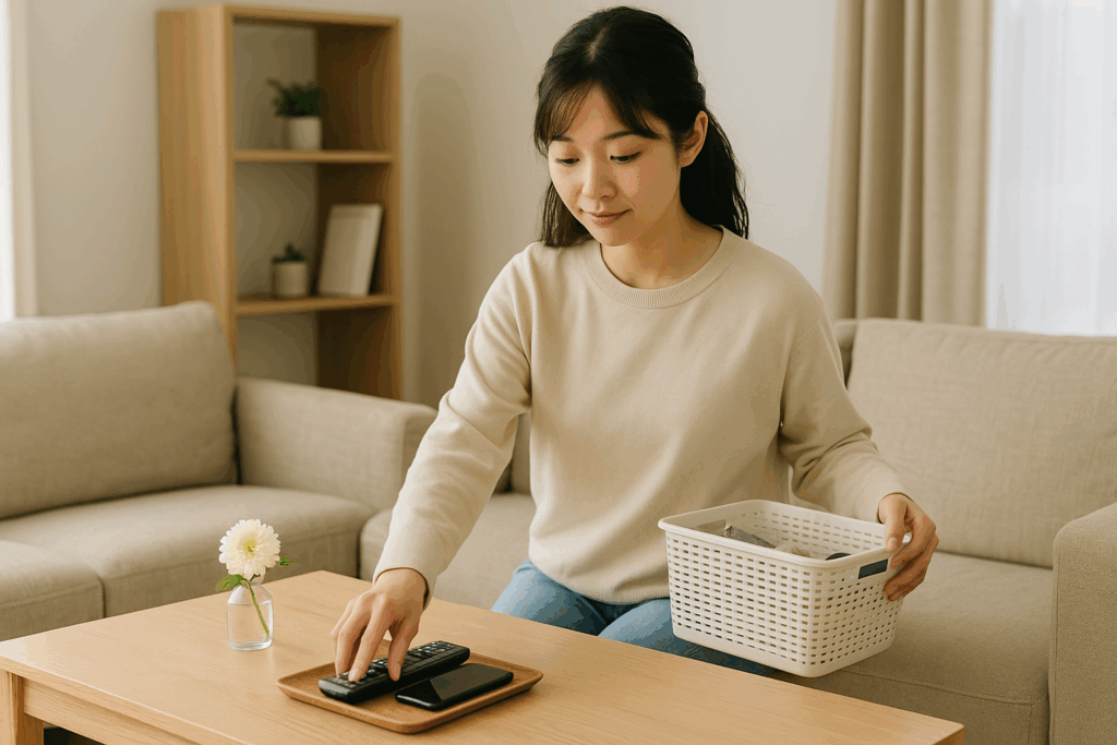 • 3日目:リモコン・充電ケーブル・紙類の定位置を決める。よく使うものこそ迷子になりがちです。小さなトレーやボックスを使って、「ここが家」と決めてあげましょう。場所を決めると戻すのがラクになり、次に使うときもスムーズです。